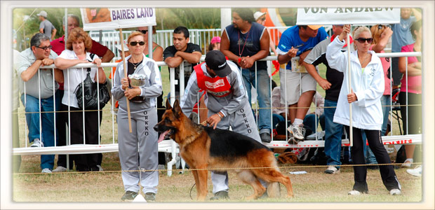 Presentó 19 hijos, con buen equilibrio de 10 machos y 9 hembras, 12 mayores de 1 año con 11 Ejemplares A y 2 seleccionados, hay mucha homogeneidad, con marcada diferenciación de sexo y marcada fidelidad al tipo del padre, es notoria las ganas de estar en pista de los perros, en la forma vigorosa que se presentan, las cabezas de los machos se destacan por su excelente masculinidad, cruz alta, excelentes angulaciones anteriores y posteriores, alguna pequeña objeción en 2 o 3 ejemplares con metacarpos un poquito lateralizados y los corvejones que deberían ser un poquito más firmes. Felicitaciones.